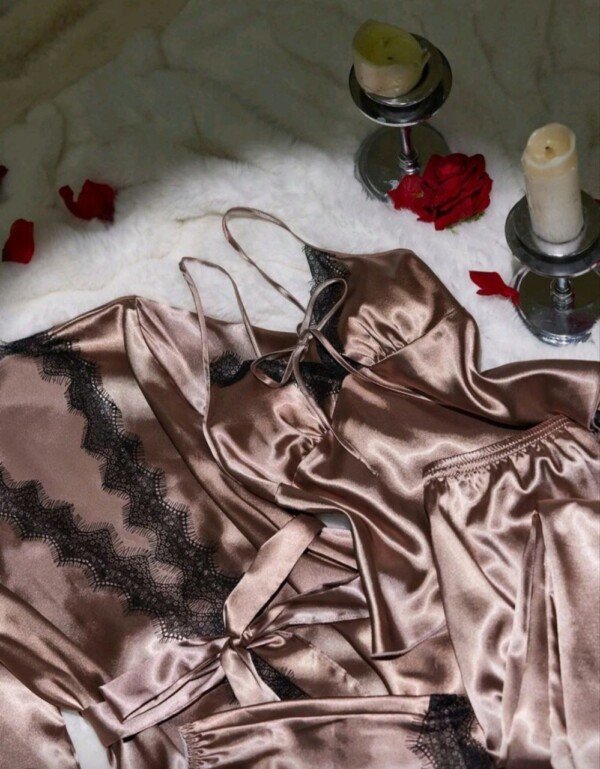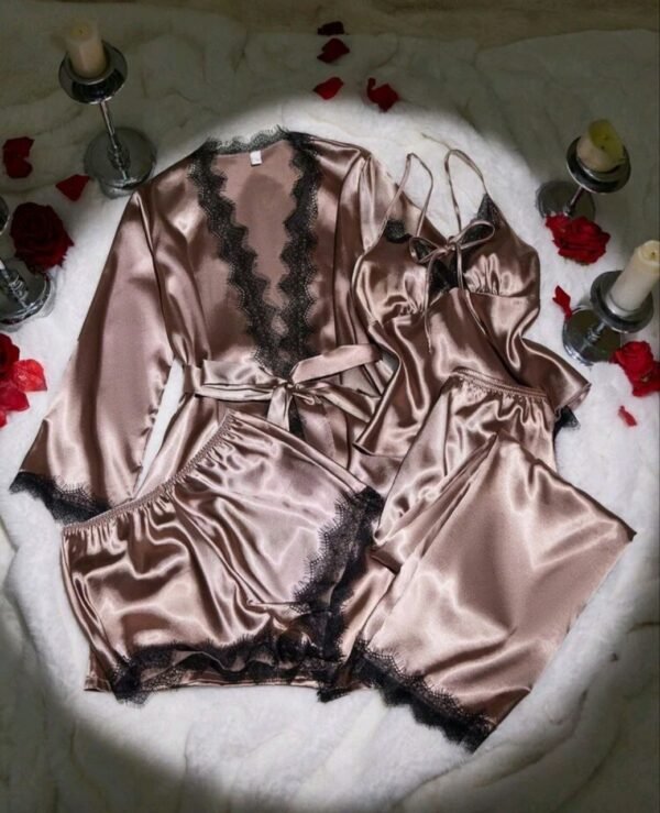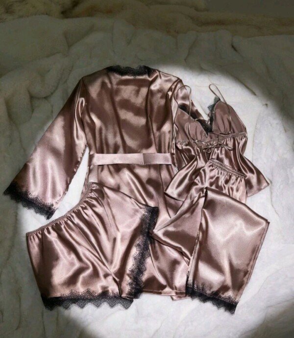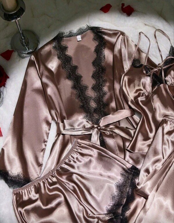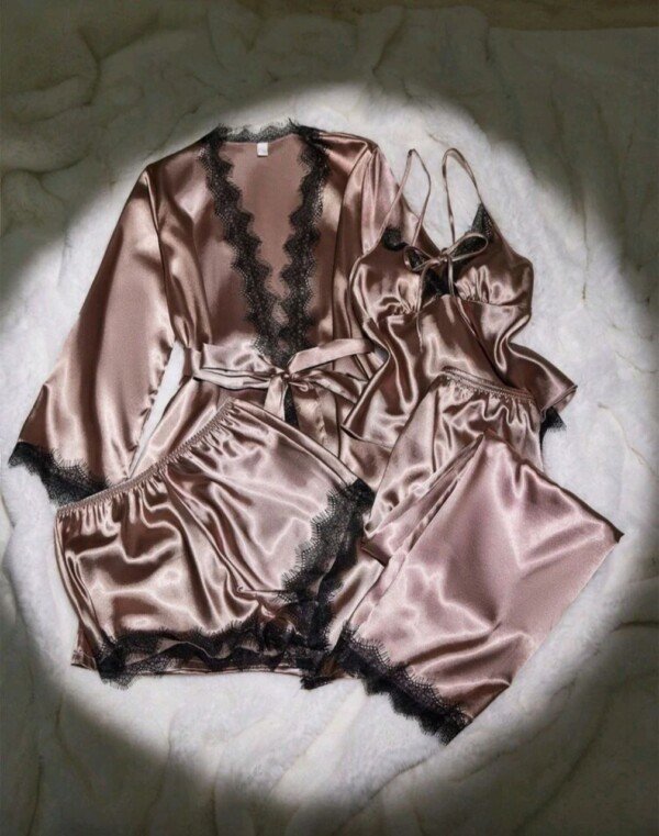طقم بجامة نوم ستان مزين بالدانتيل الاسود مكون من 4قطع