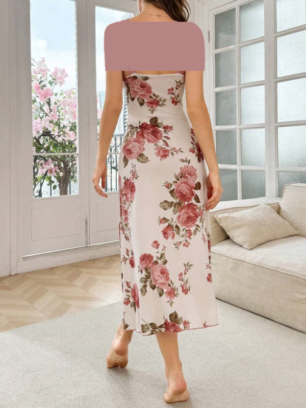 فستان نوم طويل باربطة رفيعه وطبعات زهريه وتدخيلة على الصدر دانتيل